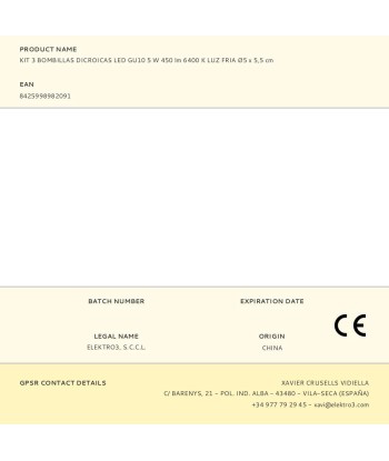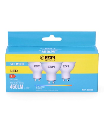 Kit 3 bombillas dicroicas led gu10 5w 450lm 6400k luz fria medidas: ø5x5,5cm (diámetro/alto) 25000h ac 220-240v clase energetica: f. angulo de apertura: 120° edm