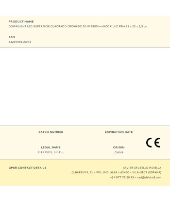 Downlight led superficie cuadrado 20w 6400k luz fria 1500lm, ip20. clase energetica f. angulo de apertura: 160°. medidas: 22x22x3,5cm cromado. 220-240v edm 25.000h