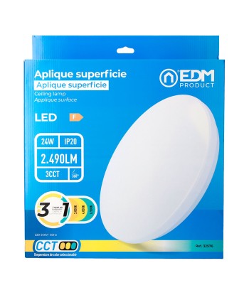 Aplique led circular de superficie 24 w 3cct (3000k, 4000k, 6500k) 2490 lm, 48 leds, flujo luminoso: 360°, ángulo de apertura: 120°, 220-240 v ~ 50 hz, ip20. vida estimada: 25.000 h, clase energética: f. medidas: ø38 x 6,6 cm, incluye kit de montaje