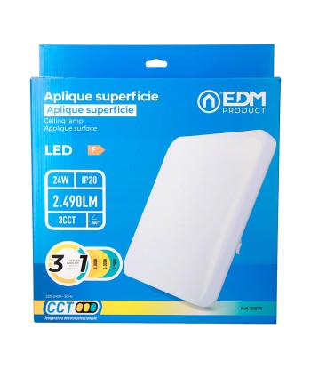 Aplique led cuadrado extraplano de superficie 24 w 3cct (3000k, 4000k, 6500k) 2490 lm, 48 leds, flujo luminoso: 360°, ángulo de apertura: 120°, 220-240 v ~ 50 hz, ip20. vida estimada: 25.000 h, clase energética: f. medidas: 37 x 37 x 6,7 cm, incluye kit de montaje